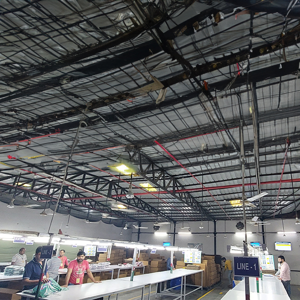 Matrix Clothing Pvt. Ltd. in Gurgaon, India, with 830 workers, joined the LABS program on February 18, 2019. An assessment on March 19, 2019, found 58 safety issues, including electrical, fire, and structural hazards. Immediate actions and regular thermographic scans addressed severe issues. Remediation included installing lightning protection, fire compartmentation, hydrant and sprinkler systems, enhanced exit doors, illuminated fire exits, smoke detectors, and seismic bracings.